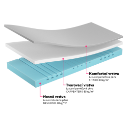 2. Belgická paměťová pěna CARPENTER® s hustotou 85 kg/m³ a výškou 6 cm - mimořádně kvalitní hutnější vrstva, která dodává matraci charakter a stabilitu. Přizpůsobuje se plynule a rovnoměrně, dokonale kopíruje, ale zároveň zabraňuje pocitu nadměrného propadání. Společně s vrchní vrstvou tvoří plných 10 cm luxusního komfortu, který patří k tomu nejlepšímu, co dnes paměťové pěny mohou nabídnout.