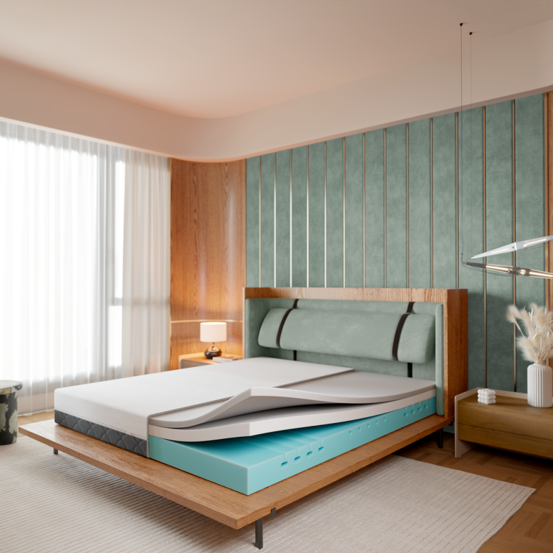 Pod ní pracuje další špičková paměťová pěna CARPENTER, hutnější a pevnější. Společně vytvářejí plných 10 cm luxusního komfortu, který rovnoměrně rozkládá tlak a přináší pocit výjimečného pohodlí.